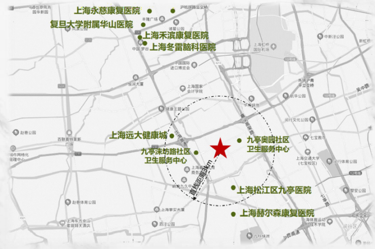 项目周边聚集着多家三甲医院和高端康复及专科医院:如复旦大学附属华山医院虹桥院区、上海冬雷脑科医院等。