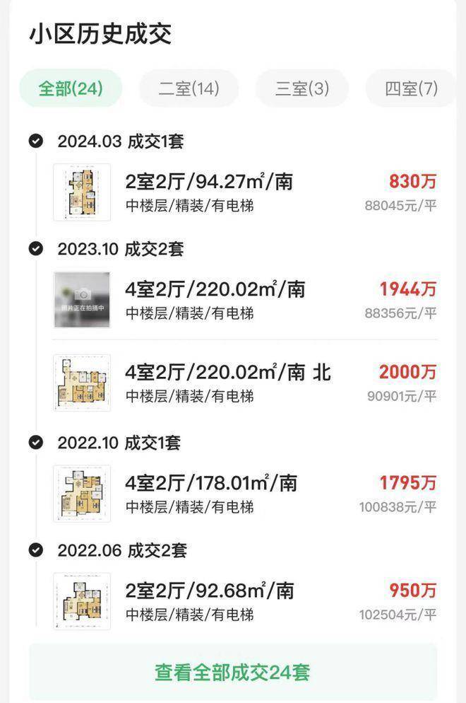 仁恒东郊花园,一套建面约94㎡的两房,24年最新成交均价为8.8万/㎡;