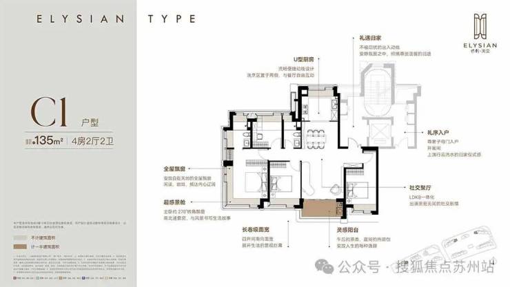 以C1户型为例,首先在面积上,上海新房市场比较宜居的面积在145m²左右,那本户型135m²的面积就很合适了。