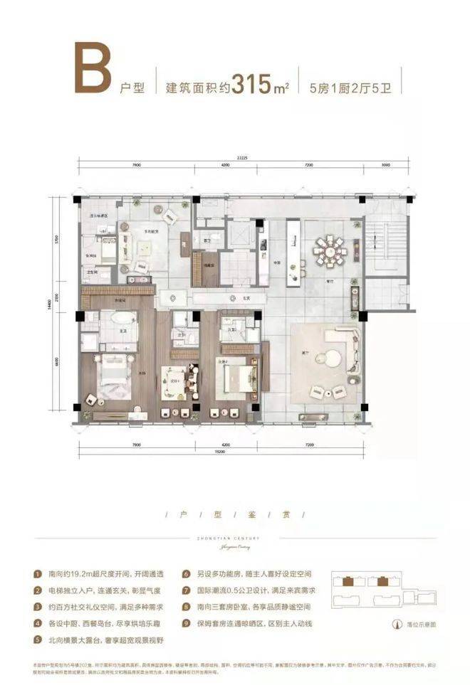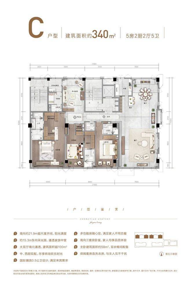 和市面上的其他宽景平层不同,HCC中天纪并没有在300多方的空间里规划出5-6个房间,而是保留了约100方空间作为公共社交空间,完全满足了商务、办公、居住等多重需求。由于公共社交空间被扩大了,因而整个房间的视野和采光面就被大大拓宽了。以C户型为例,四开间朝南,南向的总开间有近22米,西面还有15米的采光面。
