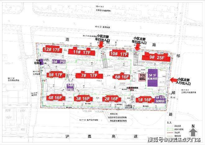 其中1号楼靠近17层的保障房,5号口为3层的配套用房;14#、15#为P站,16#为垃圾用房。