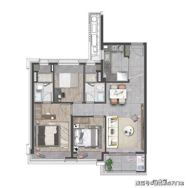 该户型贴合当代人居生活习惯,既适合三口之家小太阳家庭,也可以是三代同堂,每个人都能拥有独立空间。