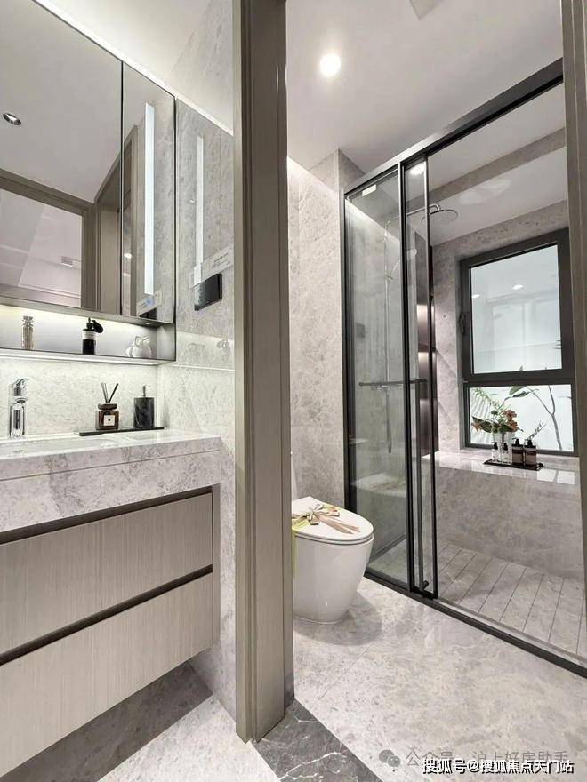 所有户型全屋墙纸交付,连电视机背景墙岩板以及主卧背景墙都是交付标准,卫生间甄选不同的石材,以此来满足功能区的需求。