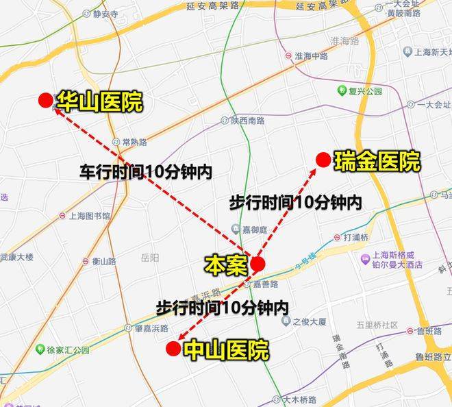 项目步行10分钟内可达瑞金医院、中山医院,车行10分钟内可达华山医院,这3个医院的名气和实力毋庸置疑。