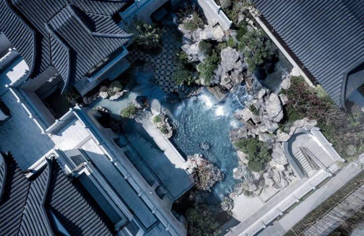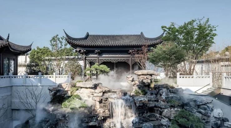 步入与山门之后,映入眼帘的是一座下沉式庭院,庭院下沉,原本平底阁楼,如今显得高耸入云。中有瀑布倾泻而下,其势有凌空之意,令观者顿生“江流天地外”的美感,叠石理水,亦有“山色有中无”的意境。