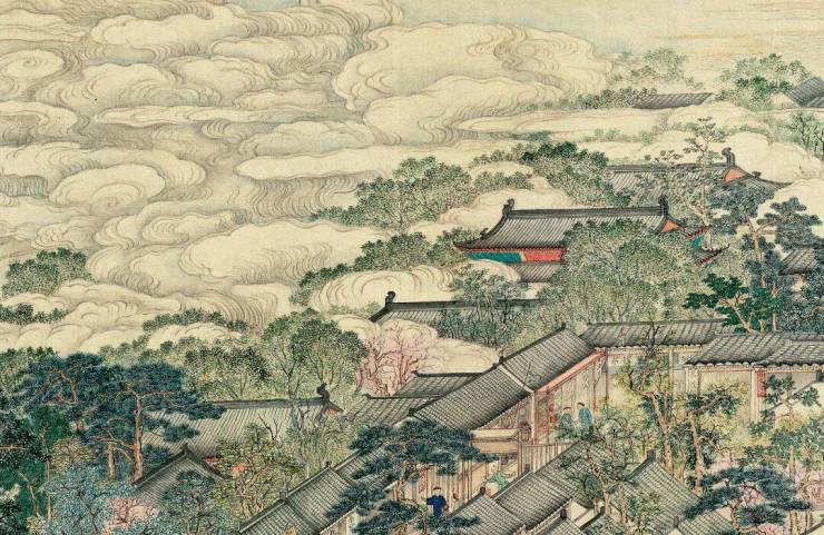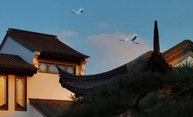 池中水面倒映着阁楼台榭的影子,仙鹤悠然,与水中天光云影虚实对应,颇有一番藏月入谷之情韵。