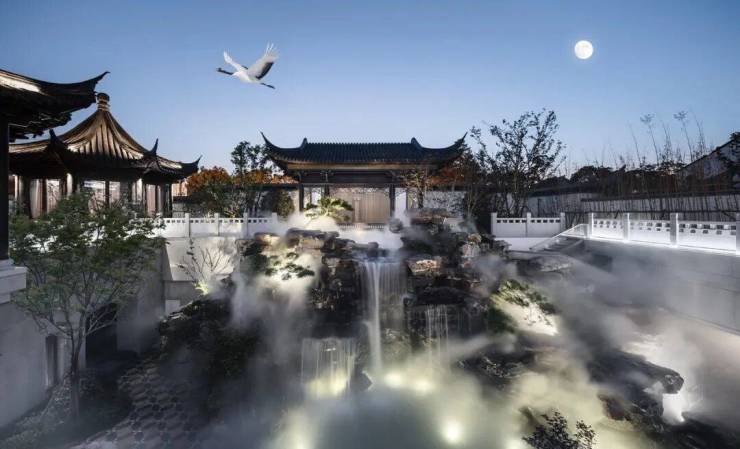 基于傍山枕河的地貌现状,整个示范区秉承江南古典园林门里有园,园里有亭,亭外有馆造园理念,规制五大东方场域:门、道、园、亭、馆,将东方古典意境贯穿其中,每一处皆演绎一味东方生活之韵。
