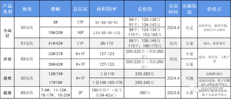 产品:11/18层小高层、6-8层洋房、叠墅、联排