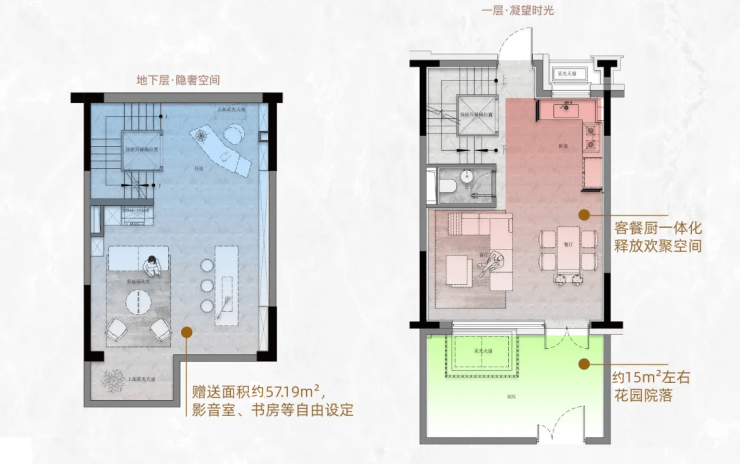 未来,业主可以从B2层的入户门厅归家,B1层打造双天窗采光井,未来,B1空间也可以视业主需求随心改造,或作为阅览室、桌球室、KTV、私人影院、酒窖等等,满足业主一切生活场景所需。