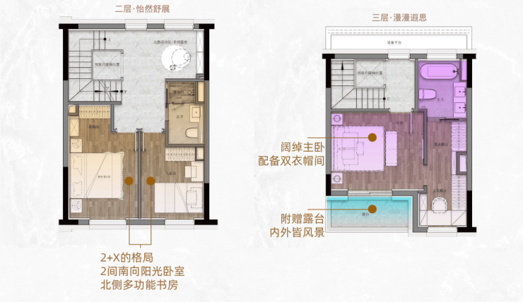 2F则贴心预留X空间,在拥有两卧的前提下,X空间的存在,让业主拥有更开阔的设计思路。