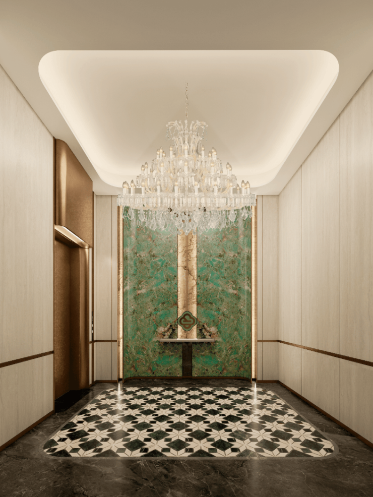 每一户还标配原厂装修的日立电梯。就连车库电梯厅也进行了豪华精装,精致的大理石拼花地面,整面墙的奢石铺装,金属质感的电梯门,每一户都拥有奢华独立的归家空间。