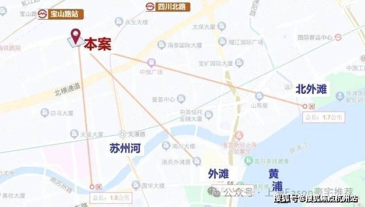仅从图上看,该地块直线距苏州河约1公里,直线距外滩约1.4公里,直线距北外滩约1.7公里,直线距3/4号线宝山路站约300米,直线距10号线四川北路站约560米,区位优势明显。