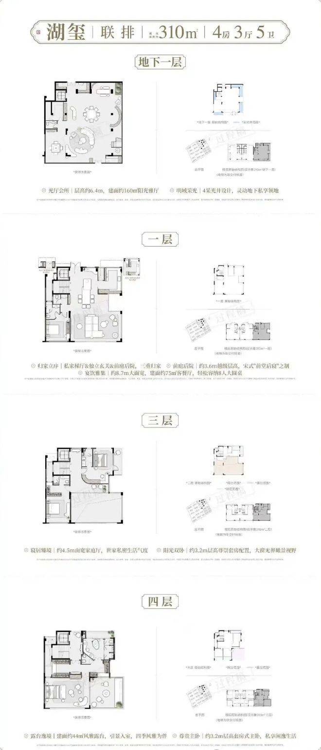 建面约182-206㎡藏品叠墅建面约258-310㎡传世联排将约6.4米层高地下室、私梯入户、奢度层高、前庭后院复刻宋人四时闲事宽幕厅堂的传世尺度,一一真实呈现。