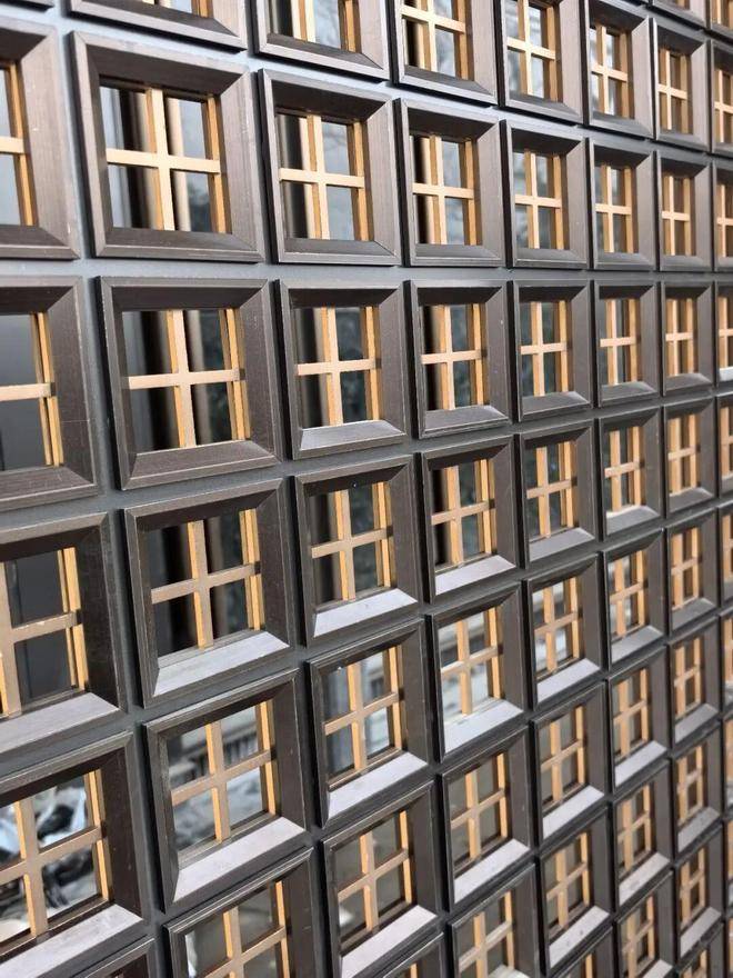门两侧屏风,以小格子中间镶嵌项目 logo 的创新形式,结合激光雕刻与纯手工打磨,将项目 logo 的每一个细节都清晰地呈现出来,最细的部分可达到 1mm,展现出无与伦比的精细度。