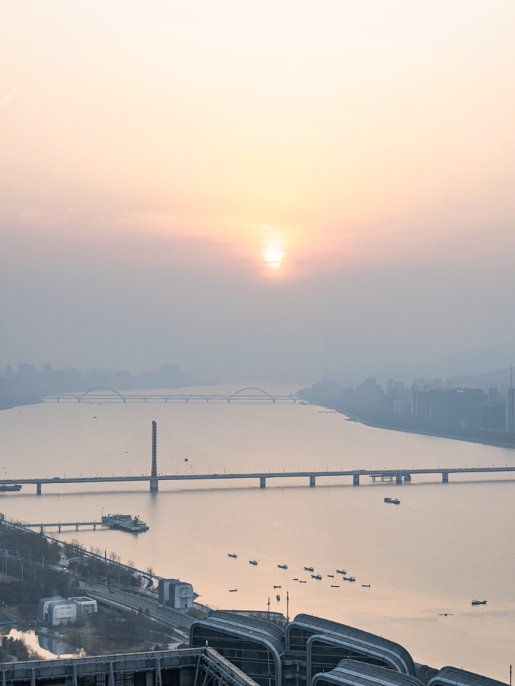 钱塘江如一条金色的丝带蜿蜒流淌,与远处的法国塞纳河遥相呼应,虽相隔万里,却在这一刻形成了美妙的对话。IOC的设计灵感来源于钱塘江的壮阔江潮及其周边丰富的城市肌理,“日出江花”与“春来江水”的主题立面对应着四季变换的自然景观,不仅赋予了建筑以生命力,也让每一位驻足于此的人们感受到时间的流转与生命的律动。