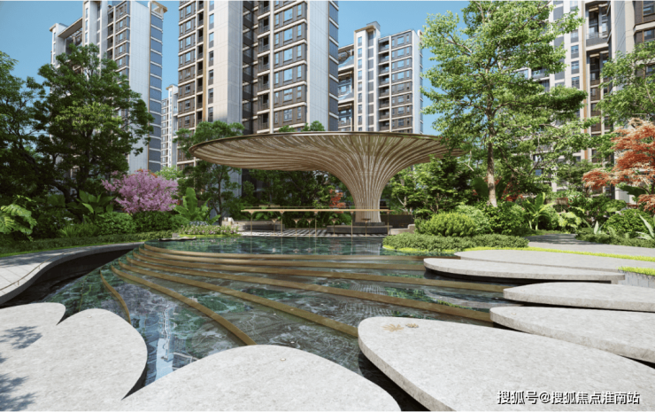 首先,大华公园柏翠利用12级叠水、2座树池、9步水上汀步,运用六重造景的手法打造近500平的中央水景!
