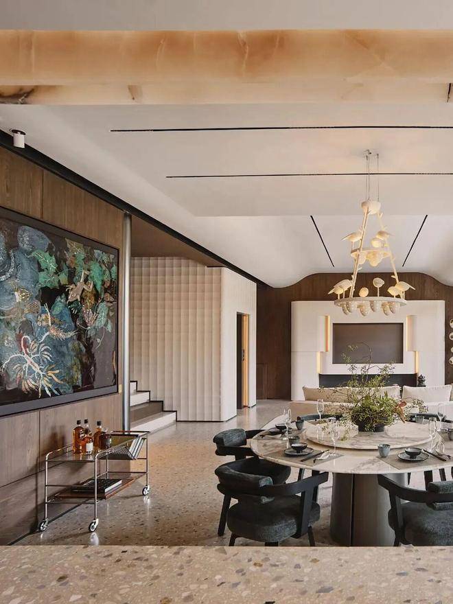 他借鉴度假酒店动线逻辑,将空间清晰划分为静区、动区及后勤区。维修人员可通过独立通道作业,不影响主人生活。同时,SPA、影院等功能互联互动,让主人在享受休闲配套之际,仍拥有充分的私密与宁静。