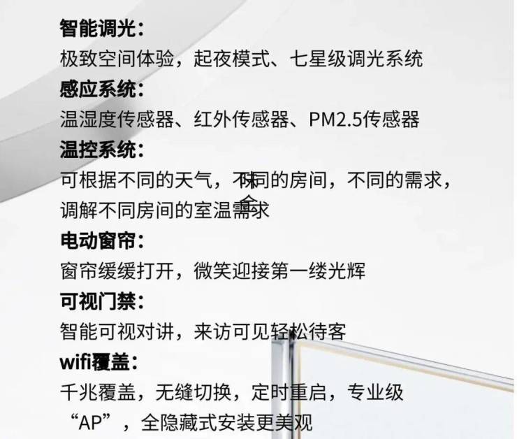 德国摩根·用科技创变生活智能调光:极致空间体验,起夜模式、七星级调光系统感应系统:温湿度传感器、红外传感器、PM2.5传感器温控系统:可根据不同的天气,不同的房间,不同的需求调解不同房间的室温需求电动窗帘:窗帘缓缓打开,微笑迎接第一缕光辉可视门禁:智能可视对讲,来访可见轻松待客wifi覆盖:千兆覆盖,无缝切换,定时重启,专业级“AP”,全隐藏式安装更美观