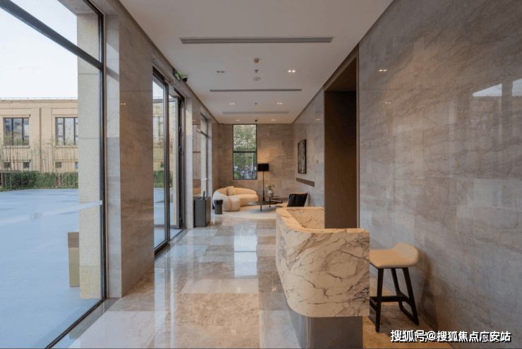 古北99的建筑立面在采用天然黄金麻石材肌理搭配灵动的线条,柔化了石材的坚硬质地,端庄典雅的同时更显时尚。
