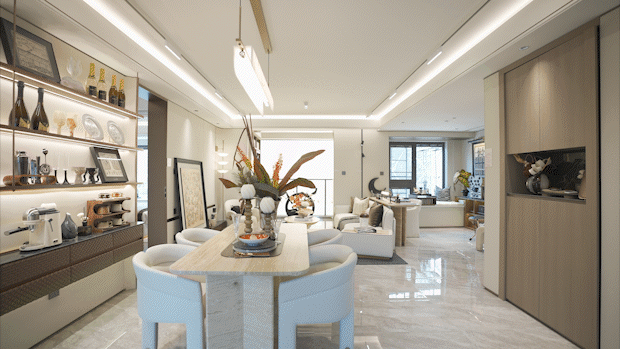 全墙纸交标结合整幅岩板客厅景墙,以定制设计感提升空间立体感。