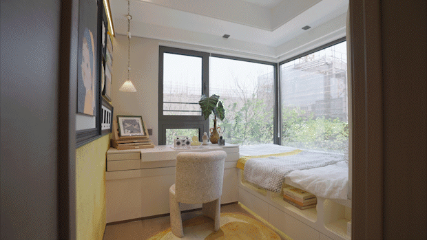 次卧实现270°L型飘窗,双向窗户采光,可以轻松拓展出书桌及收纳空间,尺度感非常不错。