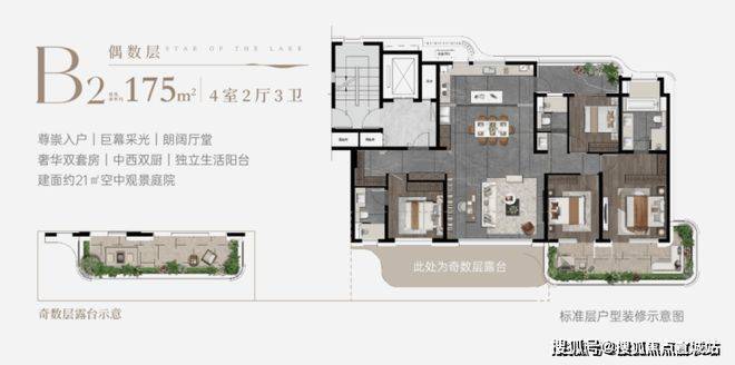 空中庭院与架空层:每户均配备空中庭院,每栋楼均设架空层;露台采用超6米挑高设计,赠送面积约15㎡-35㎡,部分户型配备约270°弧形转角露台,环幕视野,尽揽太湖浩瀚风光。