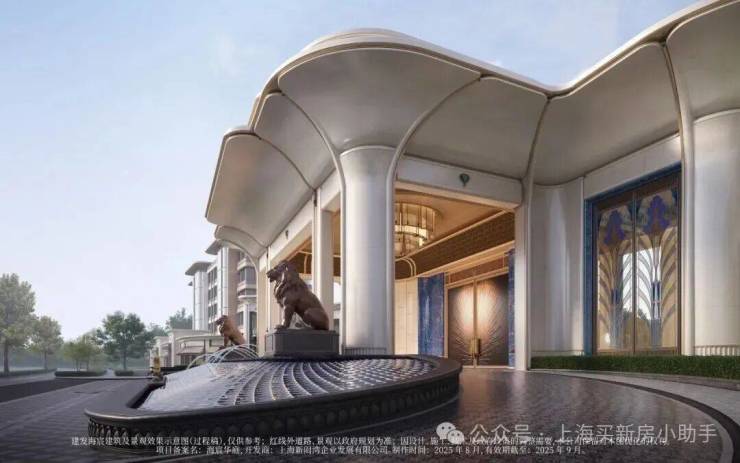 约65米环抱式落客前场,灵感源于“上海豫园-湖心亭九曲桥”,双尊威严铜狮静立、双株名贵金桂环抱一汪“尊华瑞鳞”水景,镇守家宅安宁,寓意流水生财。