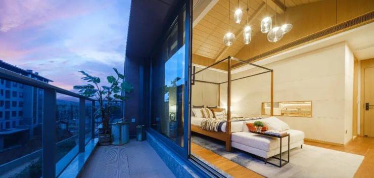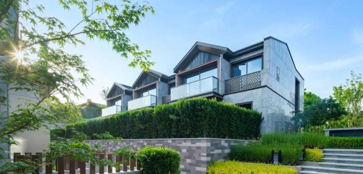 坡地联排,借鉴了瑞士温根度假小屋的概念,整体采用坡屋顶形式,外立面甄选珍贵的天然山水石石材,屋面为陶瓦,而墙、门、檐、瓦、栅等细节也随处可见中式符号,与青山湖的绿水青山、临安的人文底蕴相映成辉。