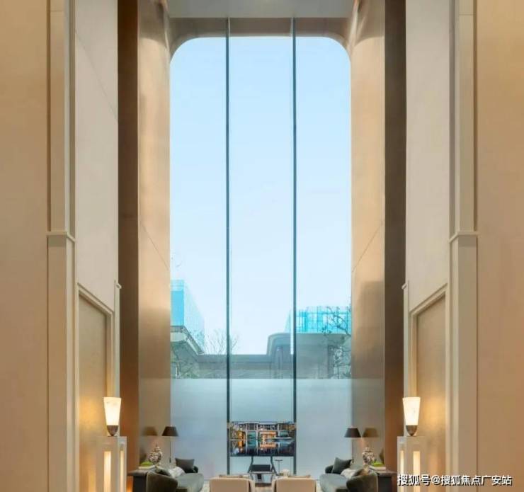 巨型超白玻璃墙,与下沉庭院风景无届链 接,让会所融入叠瀑翠谷之中,而这种巨幅超白玻,采用的是苹果旗舰店同款。