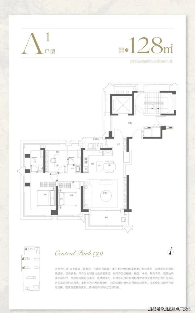 约128㎡ A户型,动静分离格局,功能区与休息区互不干扰,超大南向面宽+270°采光面,客厅开间达到了约5.4米,景观视野突出。