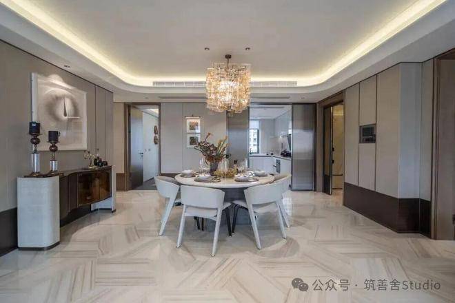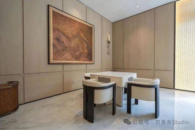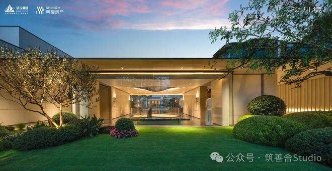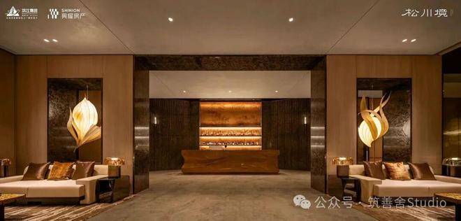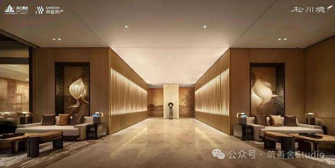 大门徐徐开启,步入序厅,眼前豁然展现《松阁观潮图》所蕴含的“动静相依”东方美学意境。定制套石的龙粼照壁在波光粼粼中熠熠生辉,构筑起松川境独有的文化印记与精神象征。松之静谧与潮之壮阔在此完美融合,每一步都隔绝了门外的喧嚣,实现了从纷繁世界到宁静家园的优雅过渡。
