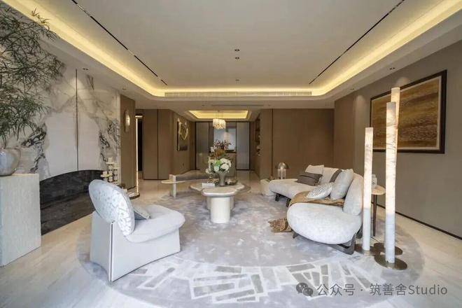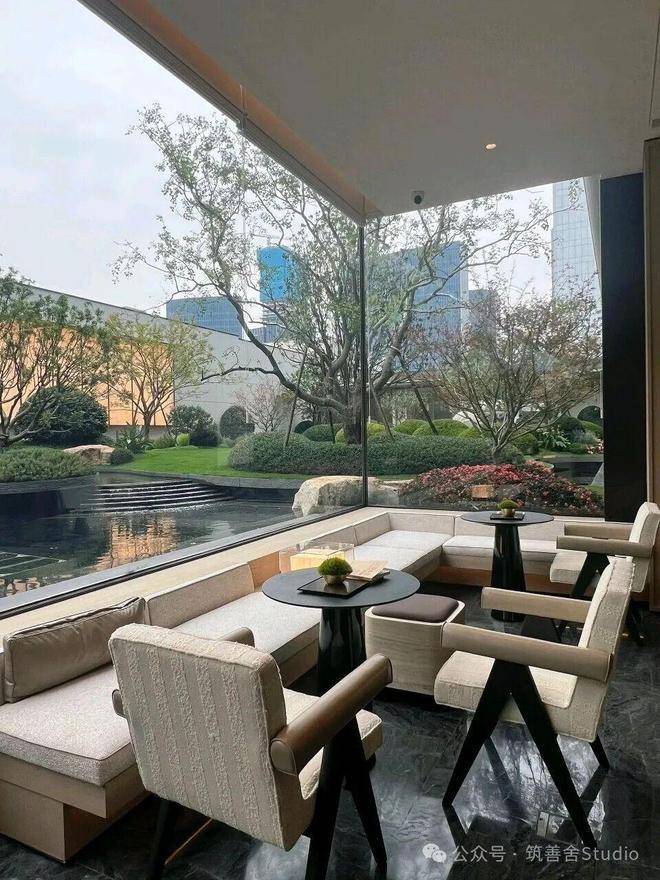 会所庭院以建筑为框,引泉植松,奢造约7米高溪山流瀑,特选6棵造型黑松。将二维的《溪山行旅图》转译为一幅“幽深与静谧、壮丽与宁静”的立体山水画卷。