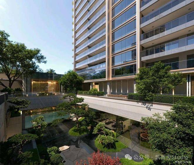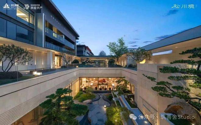 约3300平方米的中央景观,下沉式庭院与双水院景观错落有致,将《松阁观潮图》、《溪山行旅图》、《山亭文会图》三幅宋代古画,巧妙融入松川境的立体山水之中。高层与排屋区之间,一条长约210米的中轴景观横贯东西,串联起「松川十一境」的雅致画卷。该项目景观设计由北京顺景园林执笔。