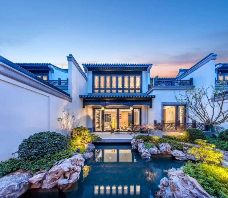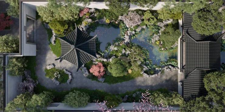 外部生态环境有多优越,自不用再多赘述。更值得关注的是项目的内里,项目与周边低密生态环境的一脉相承,对标古镇中式风格,在文脉传承和风格打造上的天衣无缝。