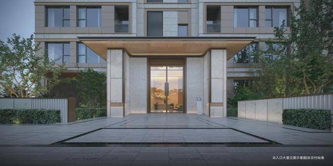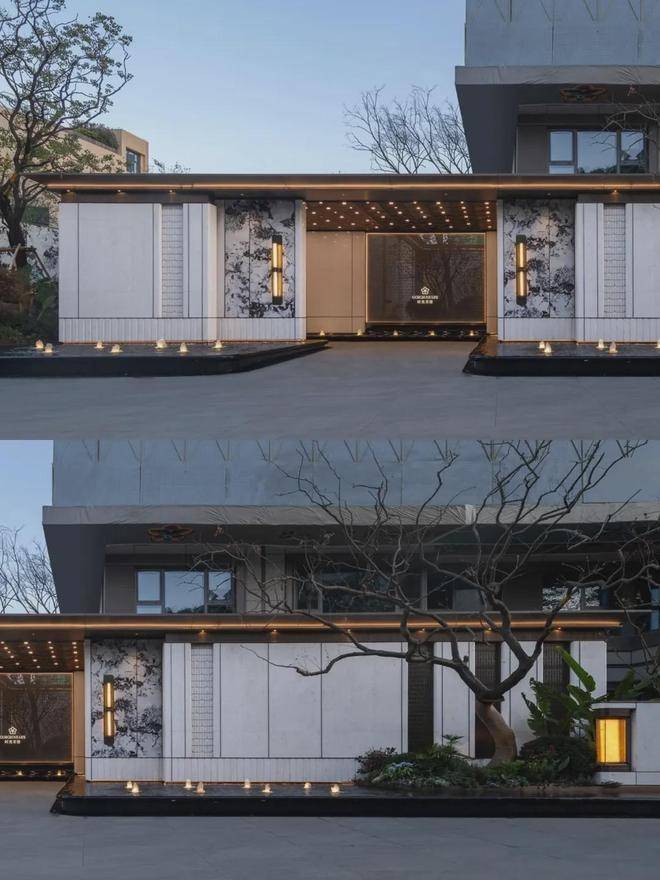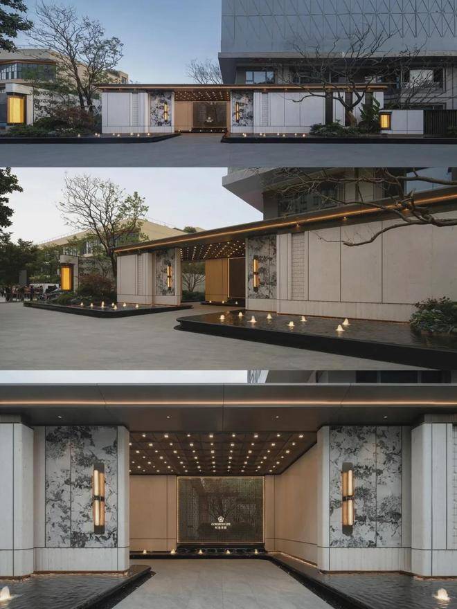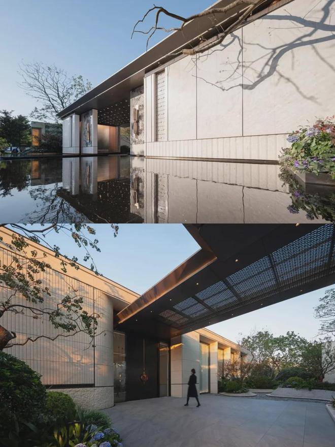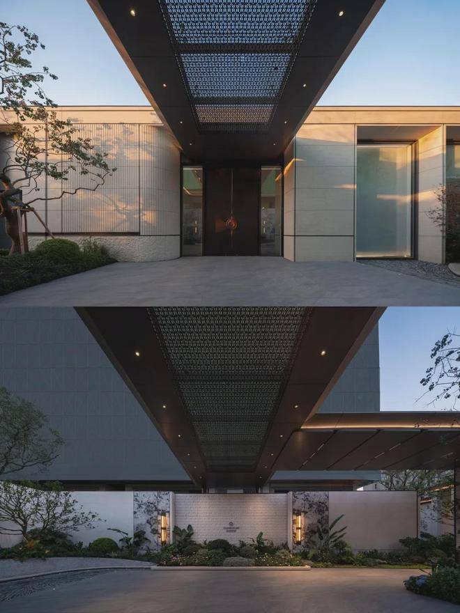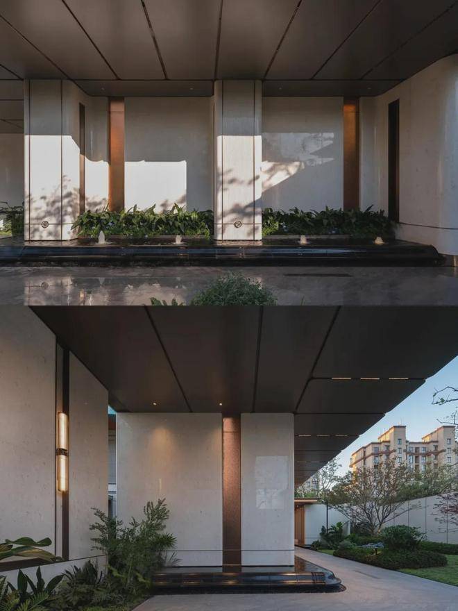 建筑立面选用米白与暖灰的现代轻奢色系,铝板线条+涂料一体板组合使用,简约线条设计,彰显现代典雅美学风格。