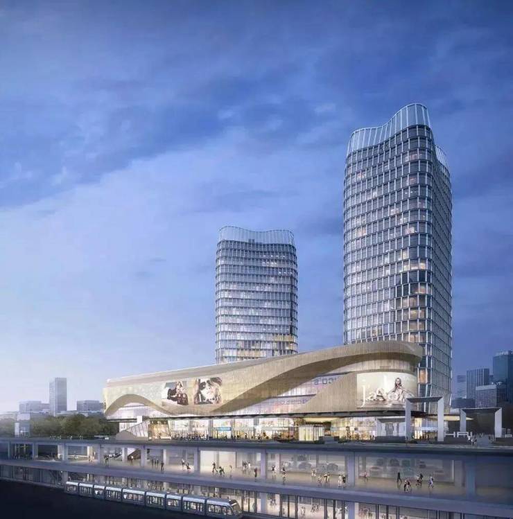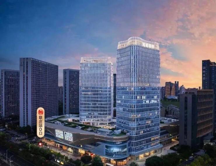 金属平纹屏凸显了塔楼顶部,这个金属屏形成的双曲塔冠,延续了塔楼的整体语言。塔冠的折叠造型使两座塔楼在杭州的天际线上形成独特的剪影。塔楼底部采用锥形造型,使其能够穿过商业裙楼,打造生长挺拔的造型。