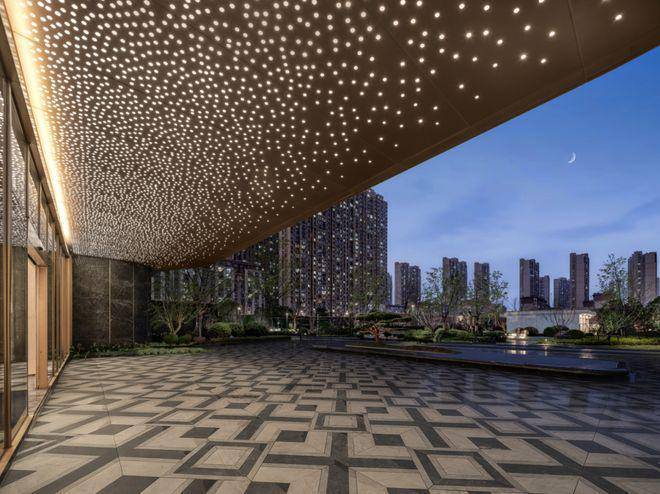 青云府门庭宽约33米,不仅搭配价值6位数的黑松,门口还做了华丽的劳斯莱斯同款星空顶,大堂内部用到了奢石铺装↓