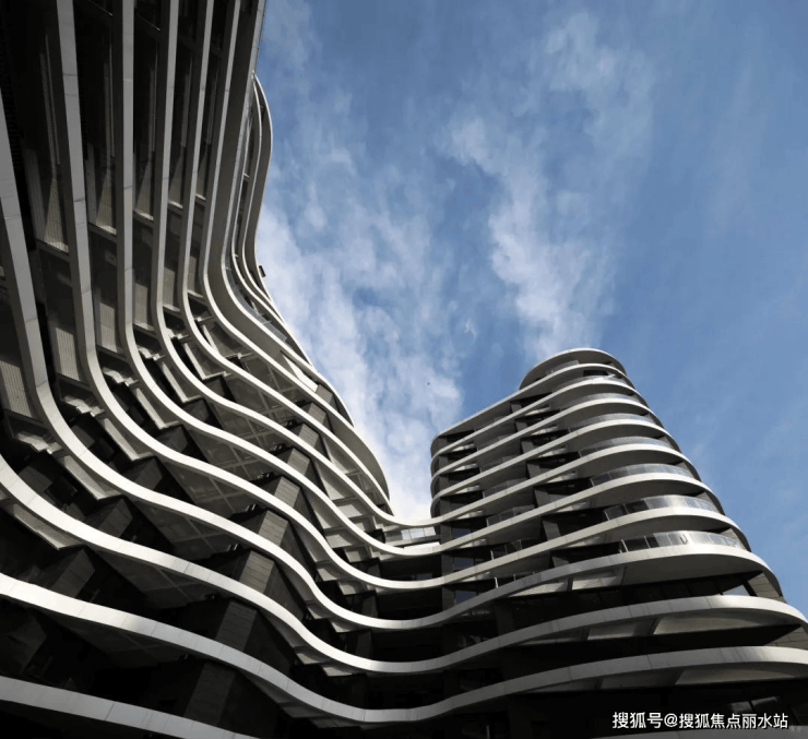 项目外立面采用玻璃幕墙现代简约风。建筑轮廓曲线蜿蜒,呈波浪线型层层迭高并后退,时尚感非常强。