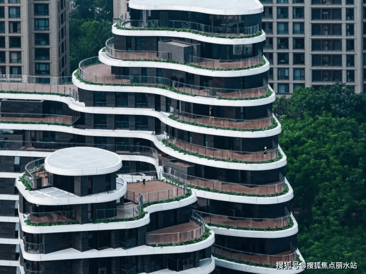 项目整体设计上与常规住宅的传统模式不同,主建筑师姜平先生提出采用自然有机的建筑轮廓,通过层层退台的设计手法,象征山川的层叠和流水的起伏,模拟自然“山水”意向,形成多维立体的城市观景露台,宛若“城市风景中的梯田”。