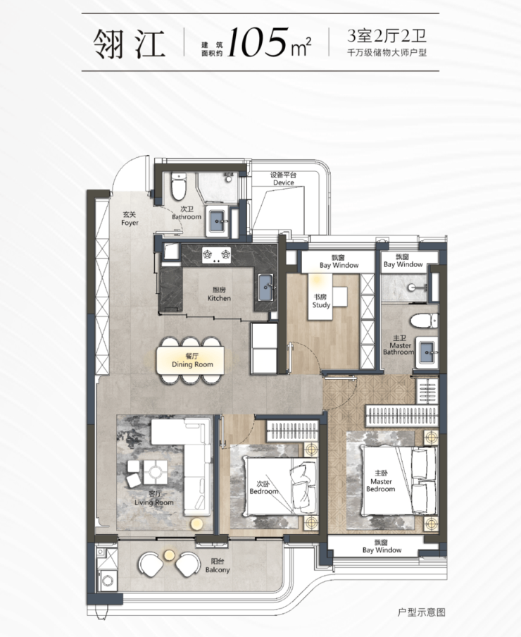 本次项目主推建面约105㎡3房2卫: