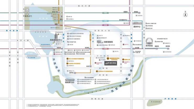 城市公园绿地环伺,项目约4KM范围内已打造成白鹭园、独墅湖生态公园、月墅公园、江滨公园、生命之源广场等约100万方生态绿肺。南侧政府重点打造约253万方吴淞江生态廊道,水系蜿蜒宽阔,滨水景观设计优美,未来将成为具有苏州特色的滨江景观长廊。