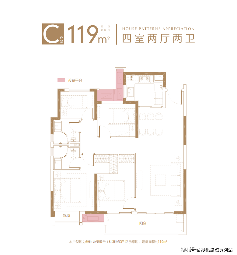 本项目备案名:璟禧云庭(北区住宅),璟禧生活广场(南区整个地块含住宅),璟禧商务中心(北区超高层+办公+沿街商业),开发商:苏州骏恒房地产开发有限公司;本户型图为6幢楼(公安编号)标准层C户型图,建筑面积约119平米,建筑面积为估算,相同户型单位因楼栋、楼层、单元等差别,局部结构、细部尺寸,面积等可能不同;户型图中的装修装饰、家居布置、空间布局等仅为示意,不作为实际交付标准或合同样品;本资料仅为要约邀请,不构成出卖人的要约或承诺,买卖双方的权利义务以双方签订的《商品房买卖合同》及其补充协议为准;相关宣传内容不排除因政府相关规划、规定及出卖人分期规划、未能控制等原因而发生变化,如有修改、调整恕不另行通知,敬请留意较新宣传资料。