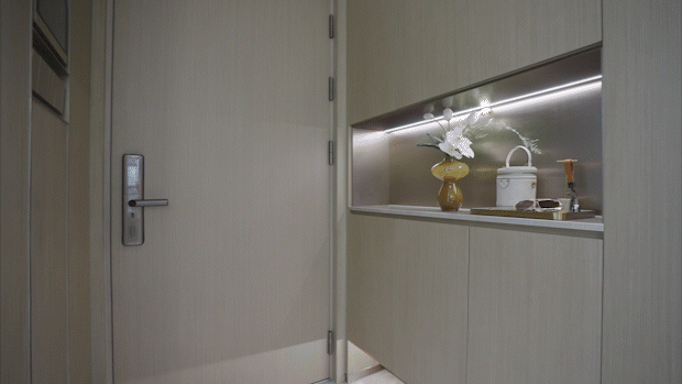 在门的背后,安排好了收纳柜,这样的提前预设好的强大收纳系统,直接解决了生活痛点。