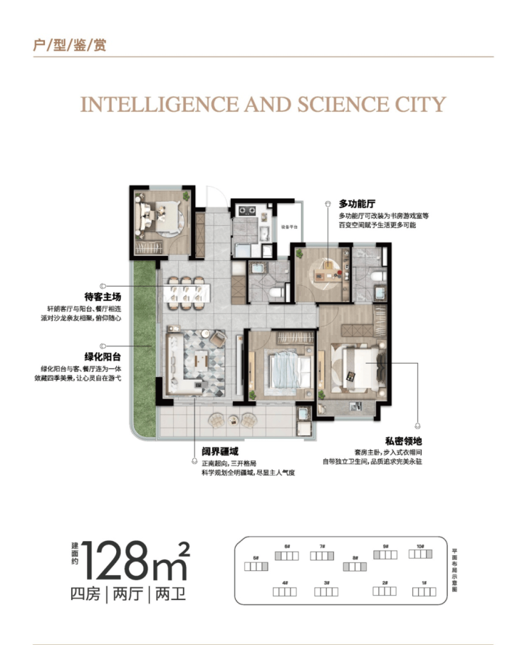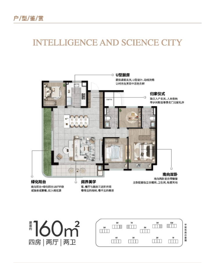 主力户型:建面约89-160㎡,采用L型绿化阳台和风雨连廊设计,配备中央空调、新风系统等科技设施,精装交付。四期项目共757套房源,容积率2.38,绿化率30%。 1