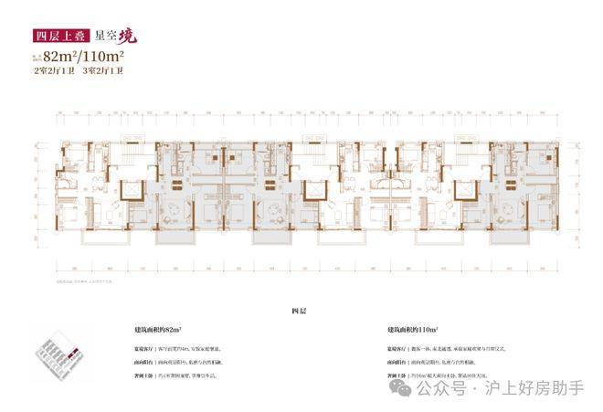 建面约82㎡2房2厅2卫/110㎡3房2厅2卫(四层上叠):
