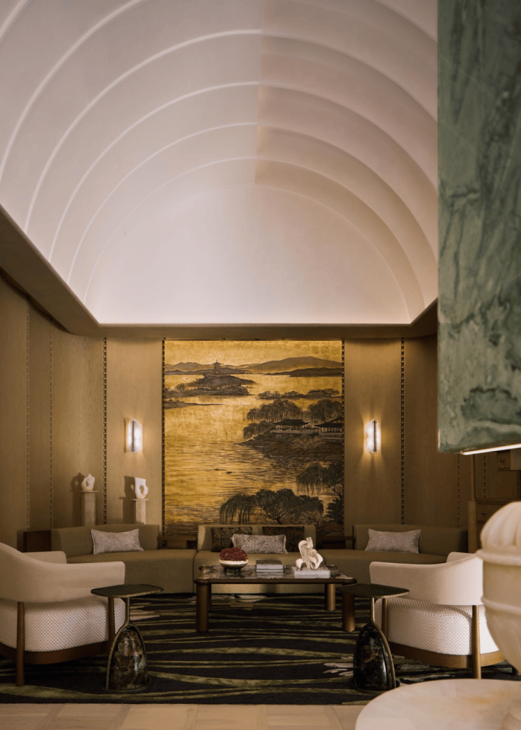 一进院落:穿门而入,步入第二重门厅「天光云廊」,同源嘉佩乐酒店的前场空间,蓝翡翠石材与安哥拉黑石材搭配,中央对景色设置丛生乌桕,尽显磅礴大气。