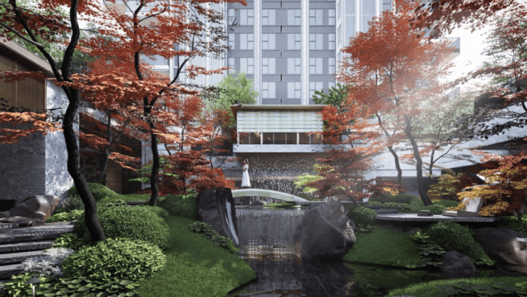1️⃣2️⃣苏韵园林,立体游观:板块内规模领先近1000㎡下沉庭院,首创立体庭院景观,借2.5米高差与6米端景落瀑,三层叠水勾勒如画意境,打造一座可游、可赏、可感的沉浸式苏韵园林。