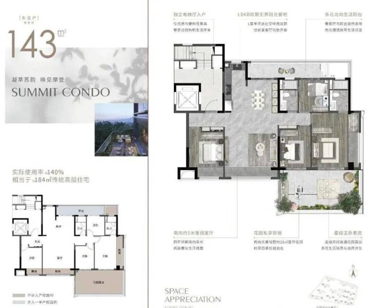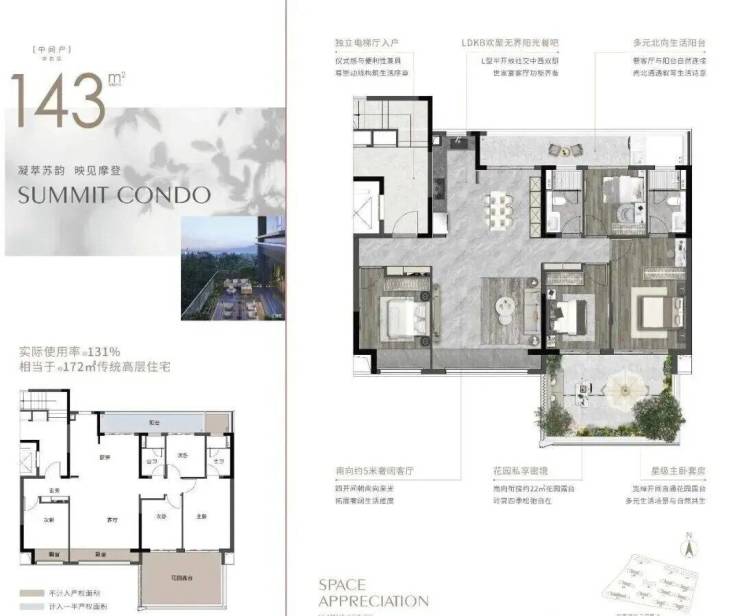 🥇建面约143㎡:欢聚无界约29㎡花园露台实际使用面积相当于传统住宅185㎡传统高层住宅
