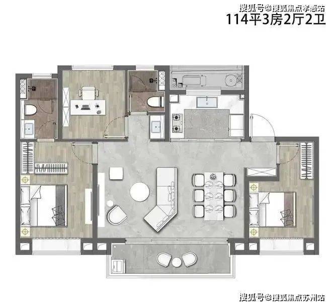 建面约114㎡3房2厅2卫户型▼