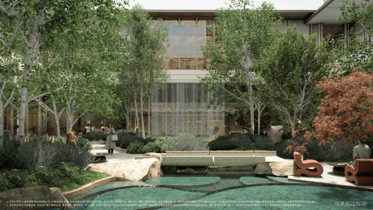 "一心两轴三花园" 的景观布局,绿植错落、水景灵动,步道蜿蜒其间,仿佛置身半岛艺奢藏馆。